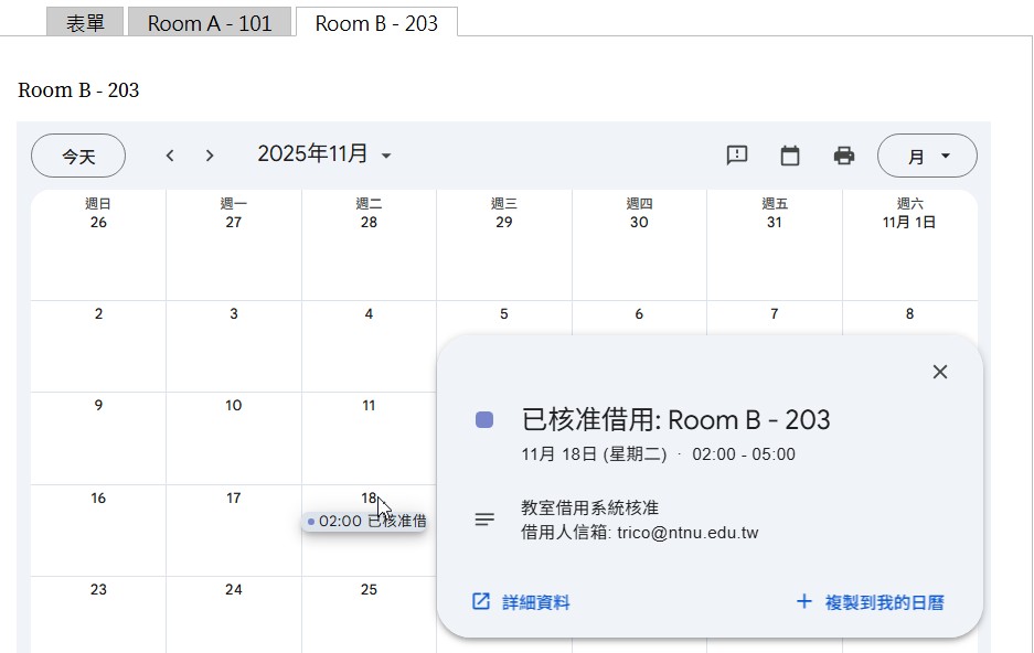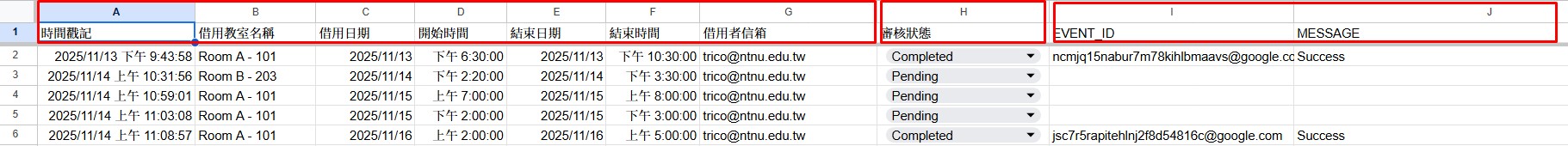 例如:CLASSROOM_NAME: 1, // B 欄 借用教室名稱